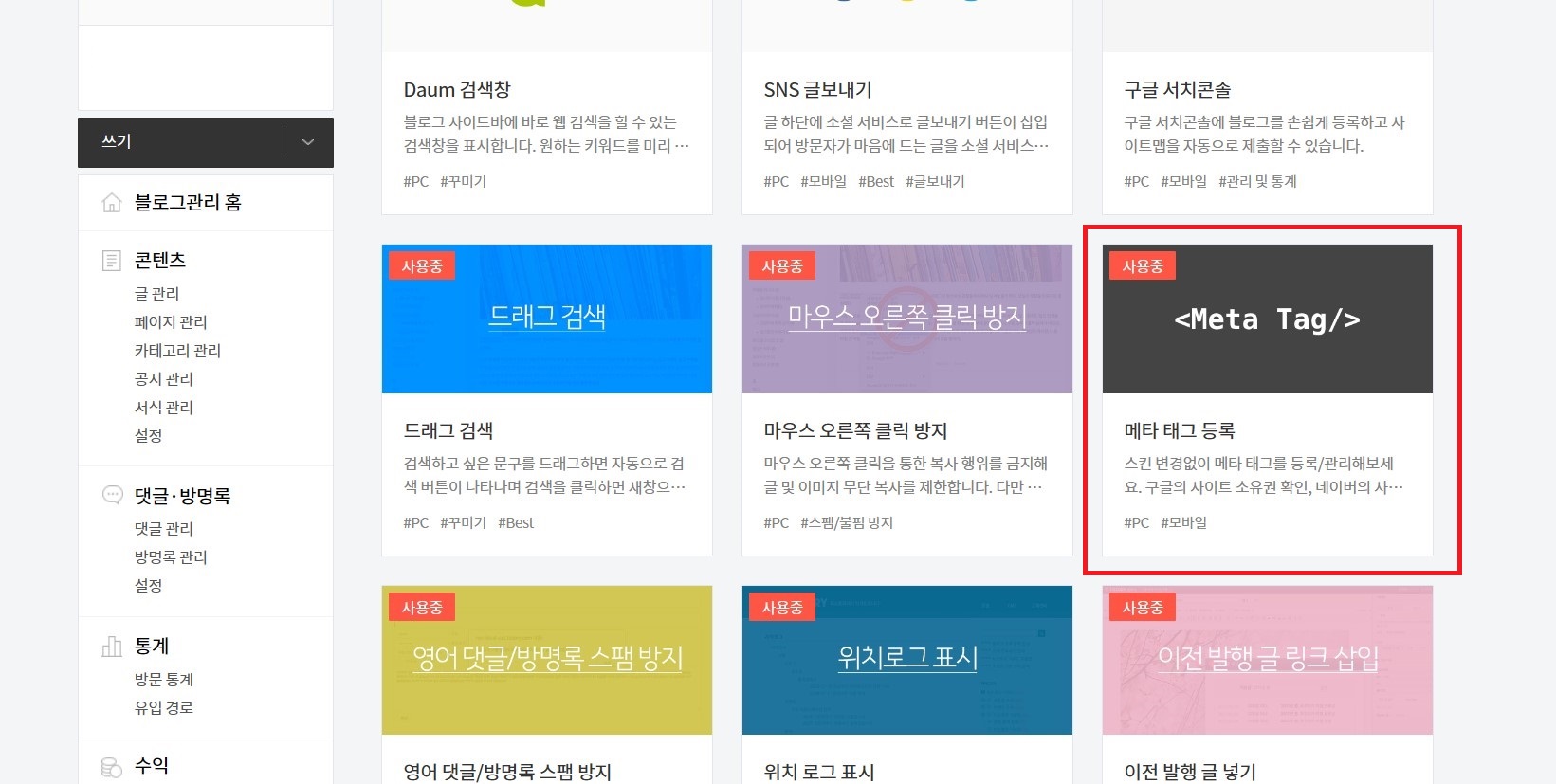 플러그인 중 아래 이미지와 같이 '<Meta Tag/>' 플러그인을 찾아서 클릭해 줍니다. 저는 이미 이 플러그인을 활성화시켰기 때문에 위에 위치해있지만 아직 활성화하지 않았다면 아래쪽에 있으니 마우스로 스크롤 해서 아래로 내려가서 찾으시면 됩니다.