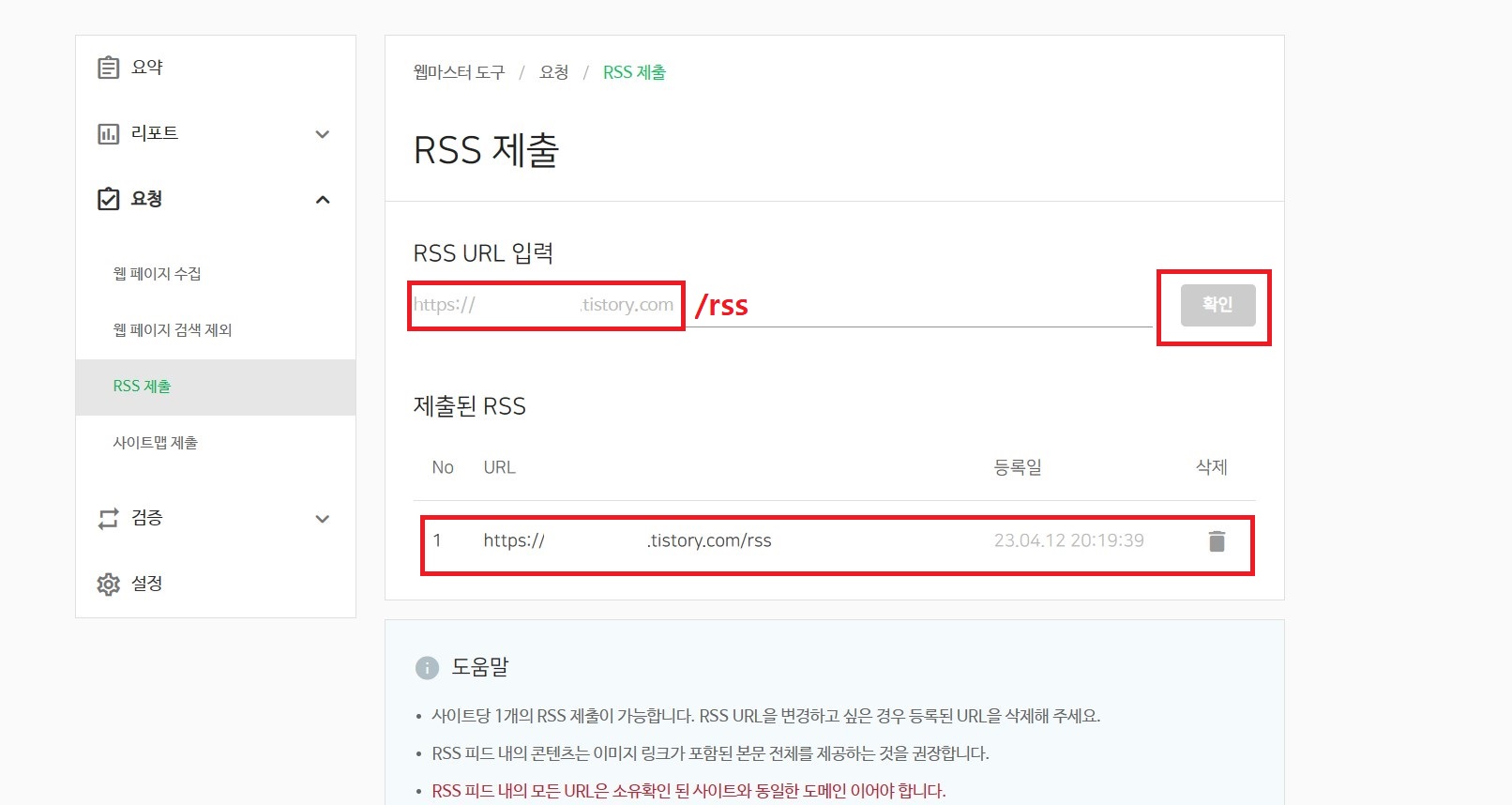 요청 내에서 'RSS 제출'을 클릭해 줍니다.