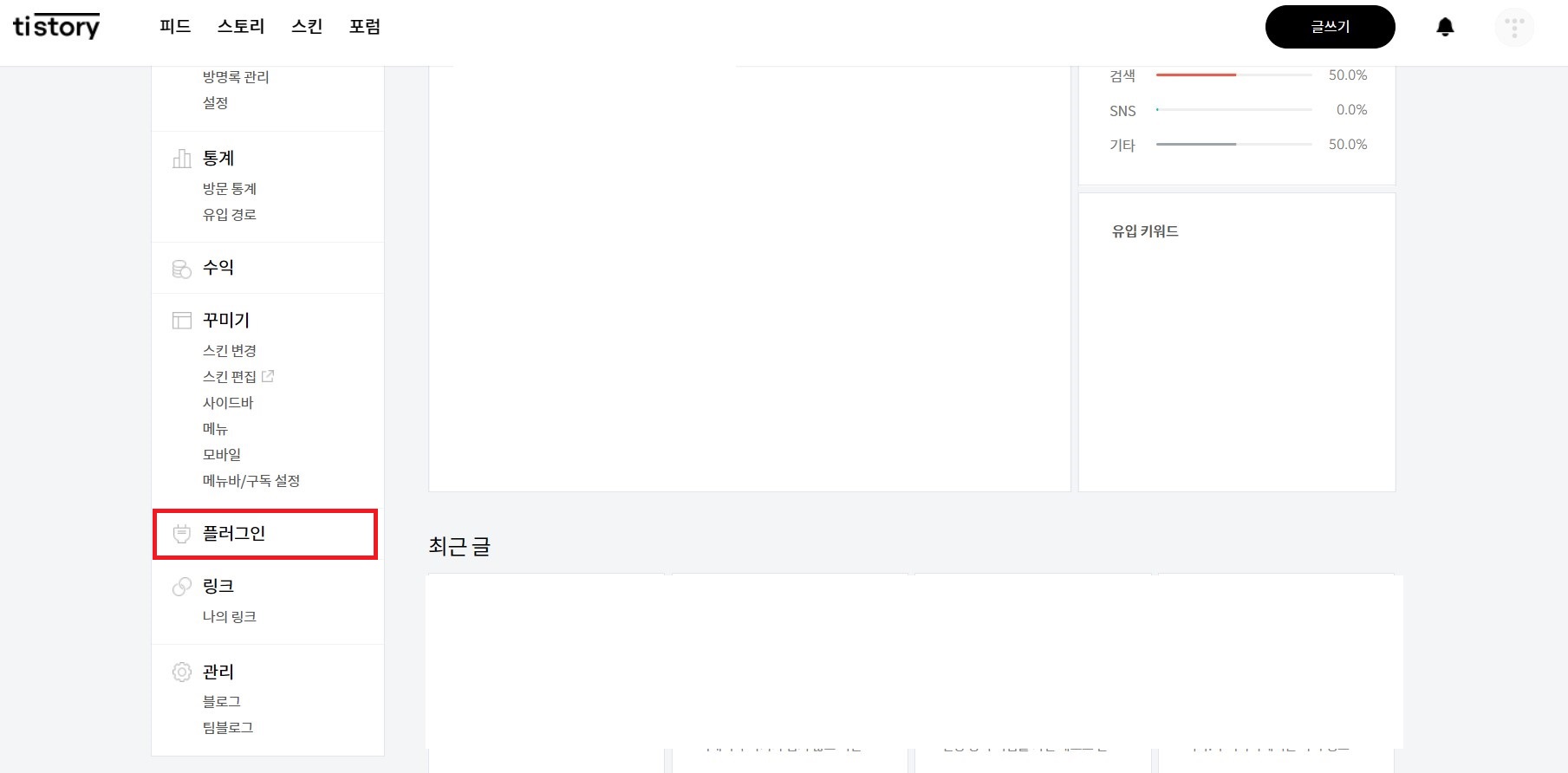 내 티스토리 블로그 관리 페이지 우측 메뉴 중 '플러그인'으로 이동합니다.