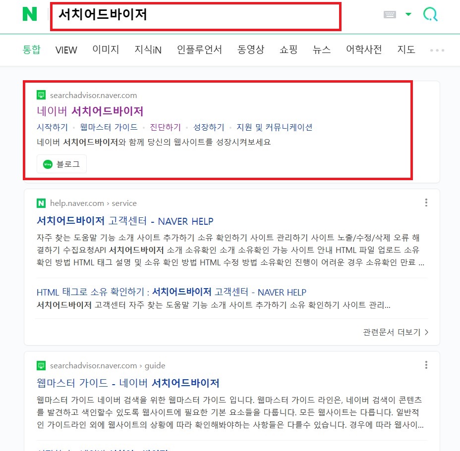 가장 먼저 네이버에 '서치어드바이저'를 검색합니다. 굳이 네이버에서 검색하지 않아도 됩니다. 그런 후 아래 캡처 화면에서 보이는 것처럼 가장 위에 뜨는 '네이버 서치어드바이저' 사이트로 이동합니다.