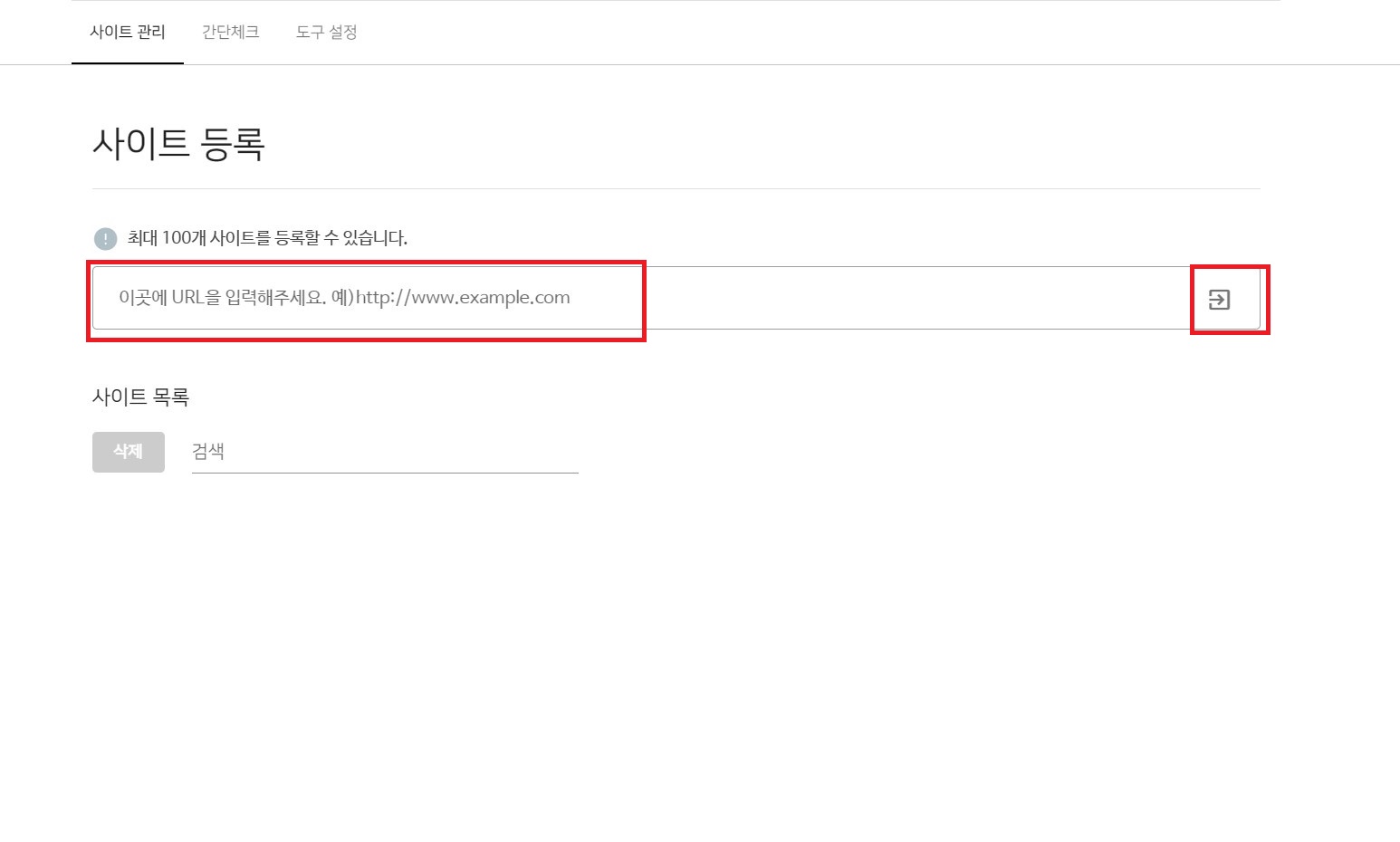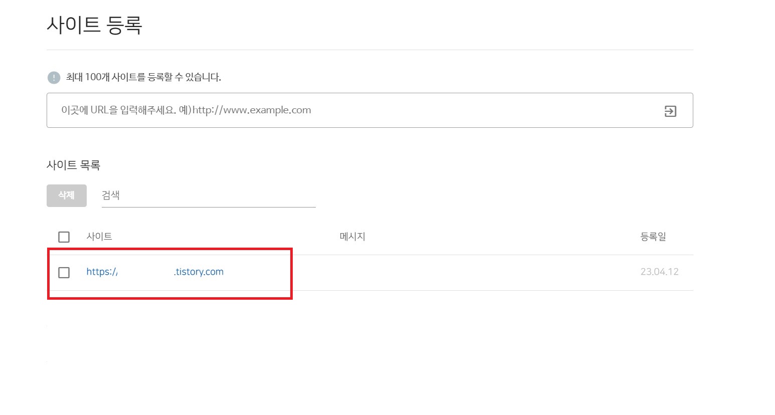 '사이트 등록' 아래 '이곳에 URL을 입력해주세요....' 칸에 본인의 티스토리 블로그의 주소인 'https://*******.tistory.com'를 입력하고 우측 화살표 아이콘을 클릭해 줍니다. 주소 오타를 방지하기 위해 본인 티스토리 블로그 메인 화면의 주소창 주소를 복사해서 붙여넣기 하는 것이 가장 안전합니다.
