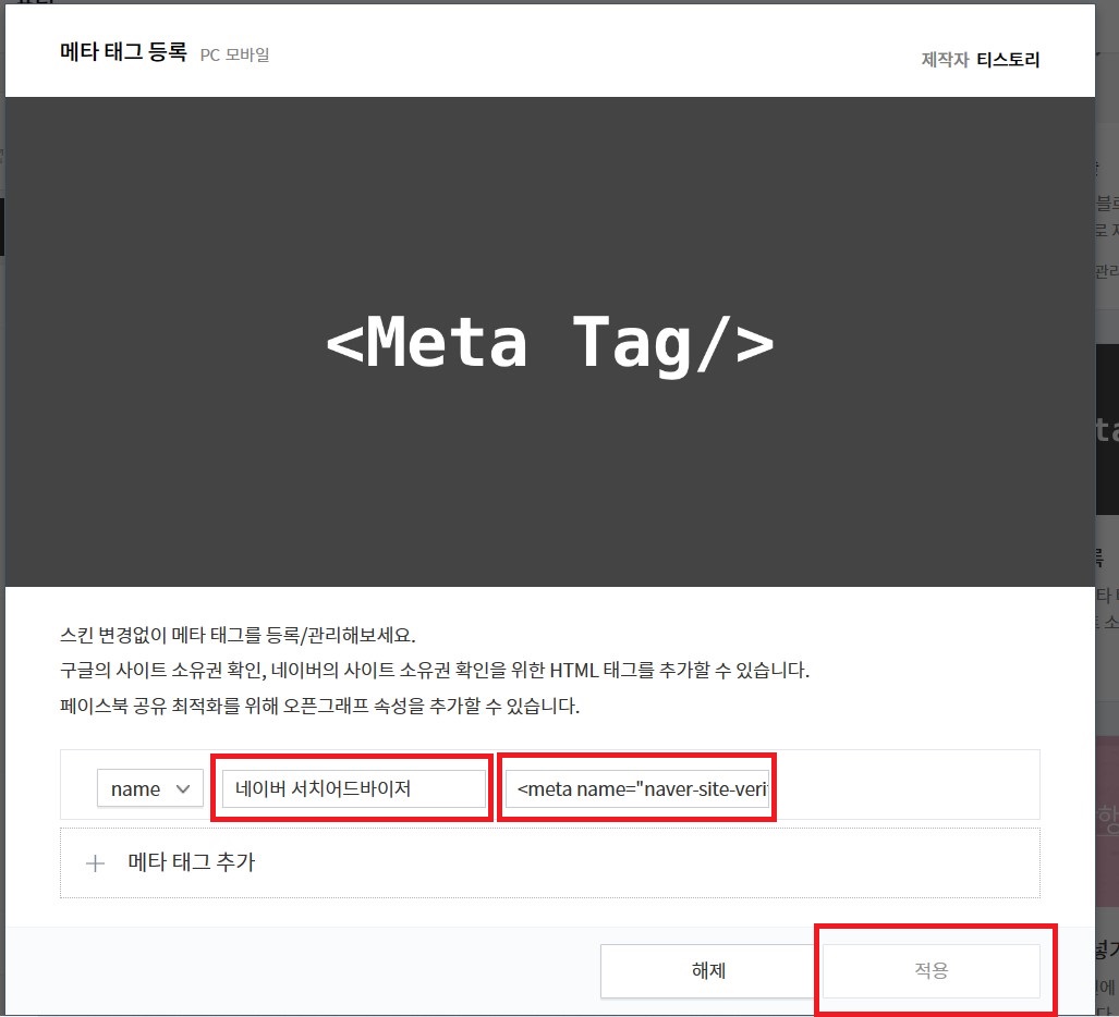 메타 등록에서 아래 보시는 것과 같이 '네이버 서치어드바이저'라고 쓰 부분은 해당 메타 태그를 구분하기 위해 본인이 원하는 이름을 작성하시면 되고 그 옆에 '<meta name='으로 시작하는 부분에 아까 네이버 서치어드바이저에서 복사했던 메타 태그를 붙여넣기(Ctrl + V) 하시면 되겠습니다. 완료 후 꼭 '적용'을 눌러야 해당 메타 태그가 적용됩니다.