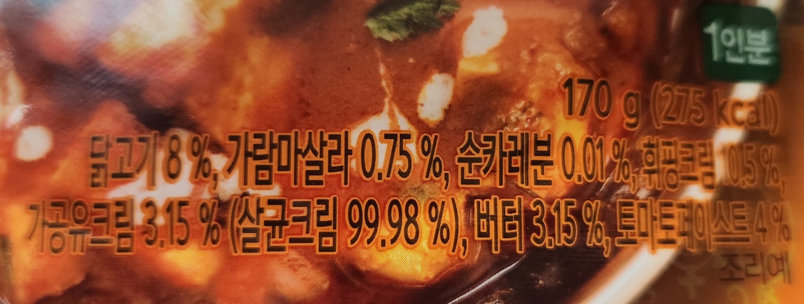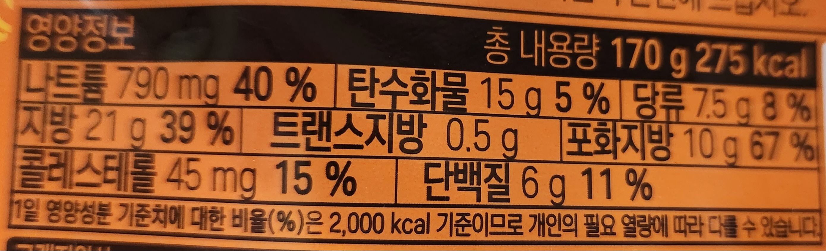 자세한 영양정보. 총 내용량은 170g, 칼로리는 275kcal. 다양한 크림 종류가 들어가서인지 지방과 포화지방의 함유량이 낮은 편은 아니다.