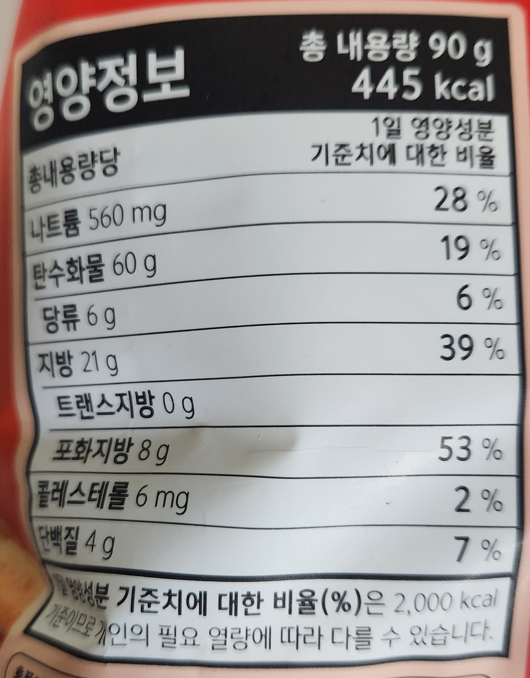이 외에 새우씨즈닝 0.8%, 새우맛조미유가 0.19%가 함유되어 있다. 총 내용량 90g에 칼로리는 445kcal인 과자.