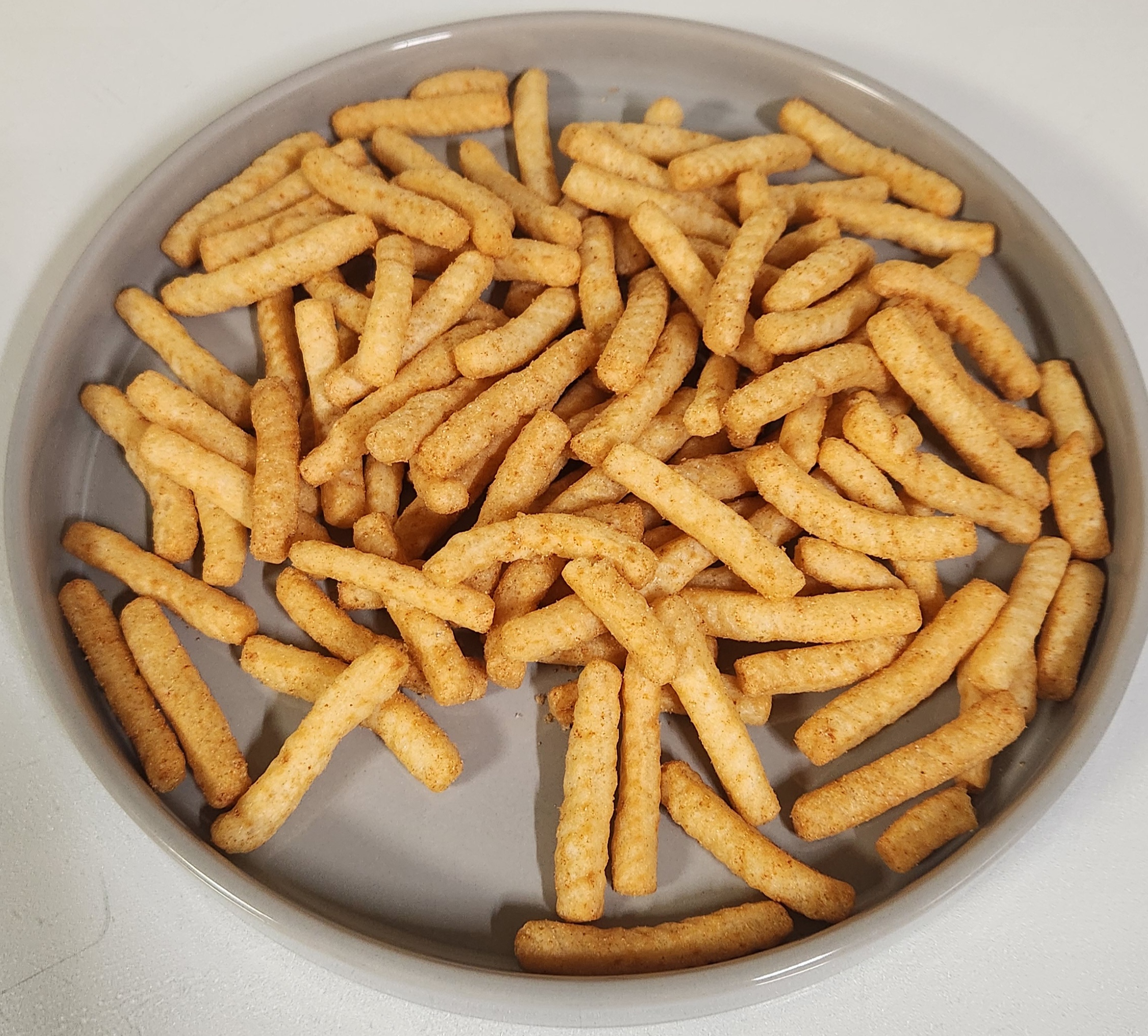 양을 가늠하기 위해 내용량 모두를 그릇에 담아보았다. 과자 한 개당 사이즈는 새우깡 과자의 크기와 대동소이.