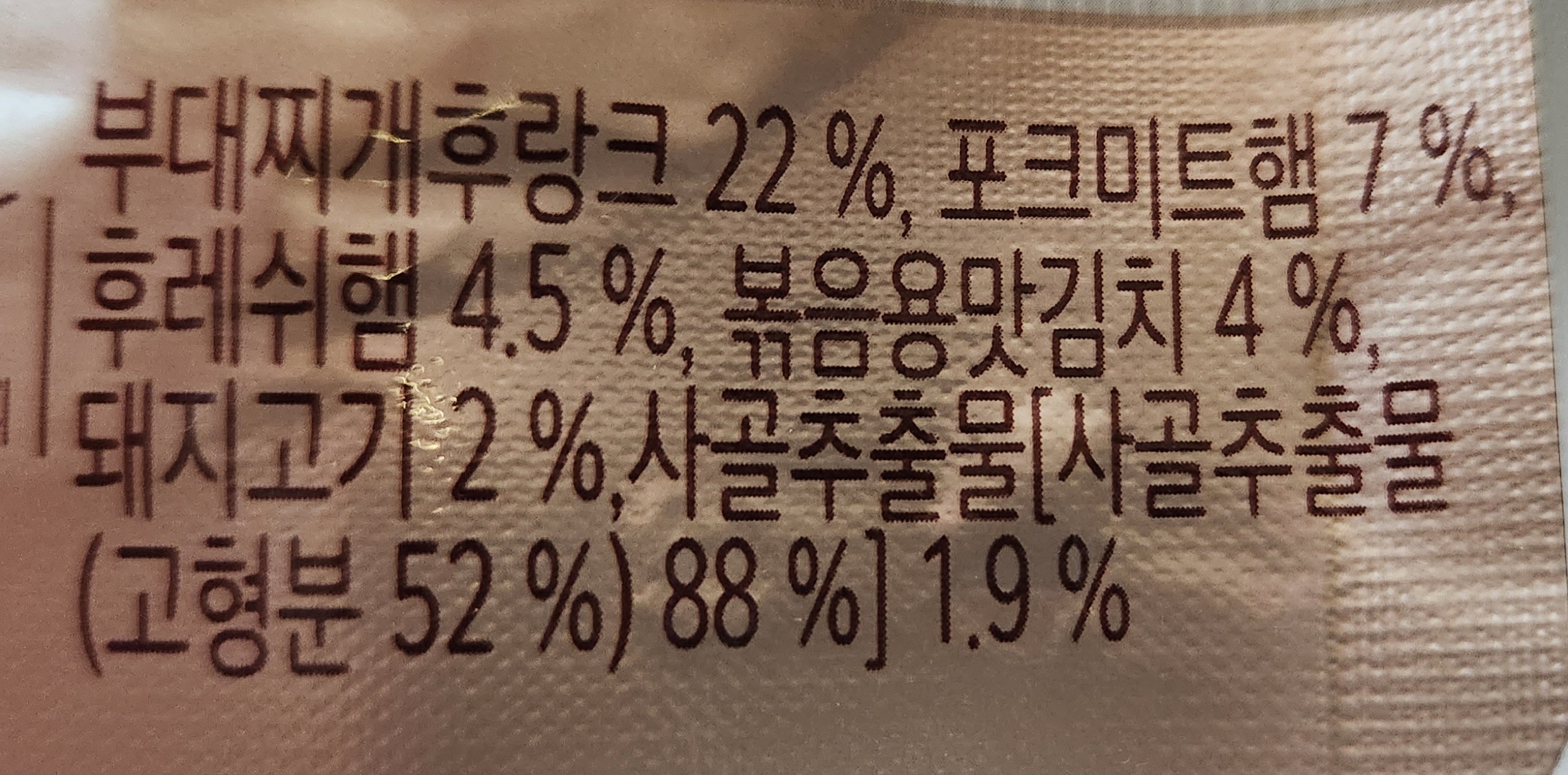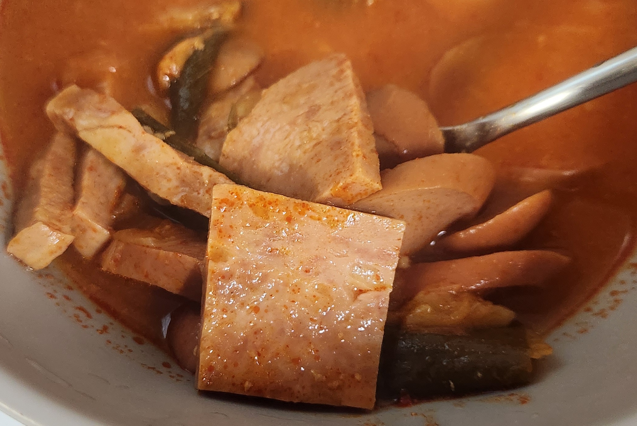 햄과 소시지의 종류도 꽤나 다양한 편. 건더기의 대부분이 햄과 소시지로 구성되어 있다고 해도 과언이 아닐 정도로 햄과 소시지는 많지만 그만큼 다른 건더기는 거의 찾아보기 힘들다. 하지만 햄과 소시지를 얼큰한 국물과 함께 먹기 위해 부대찌개를 선택하는 경우가 많기 때문에 이런 구성에 불만을 가진 소비자가 많을 것 같지는 않다.