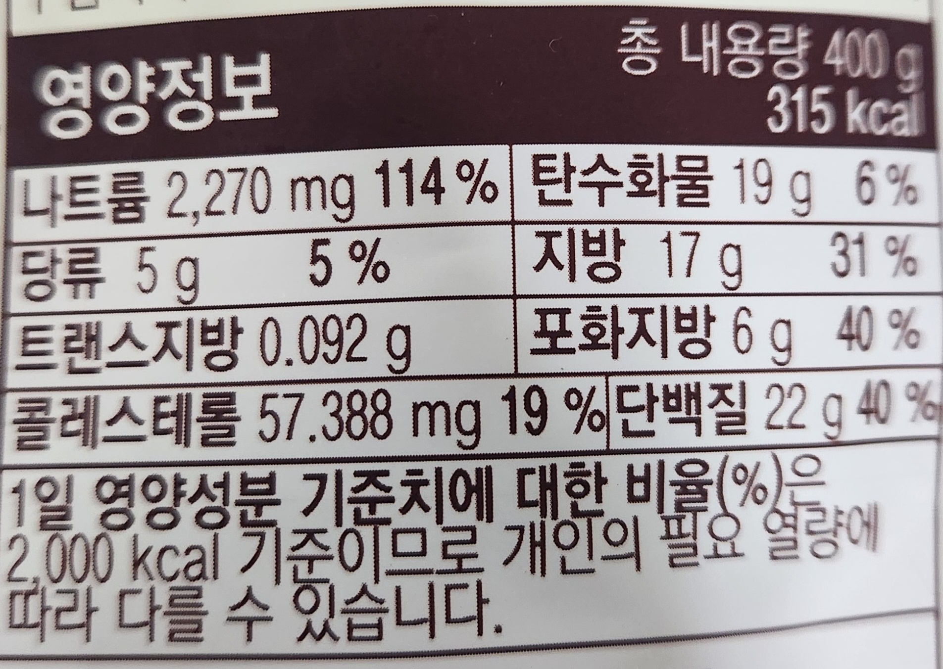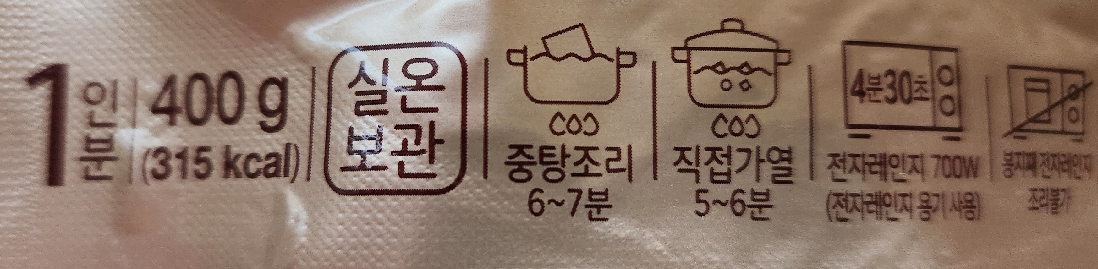 자세한 영양정보 및 조리방법. 총 내용량 400g에 315kcal의 칼로리를 가진 제품.