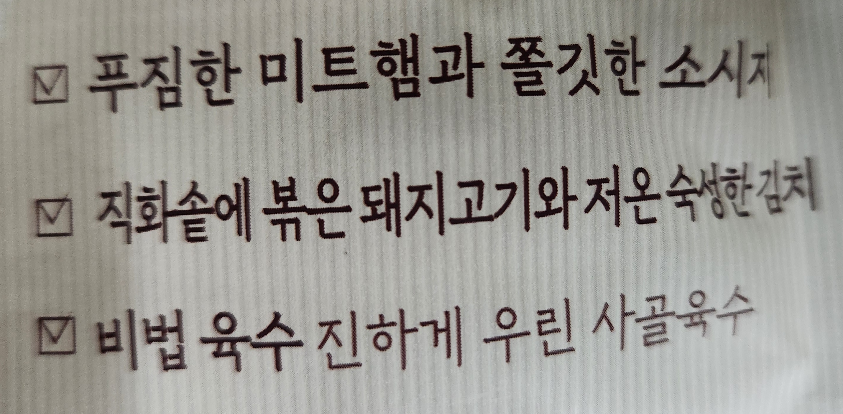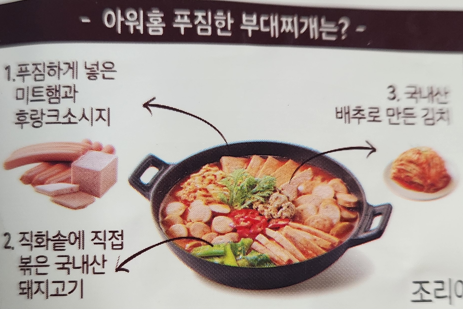 '푸짐한 미트햄과 쫄깃한 소시지', '직화솥에 볶은 돼지고기와 저온 숙성한 김치', '비법 육수 진하게 우린 사골육수'.