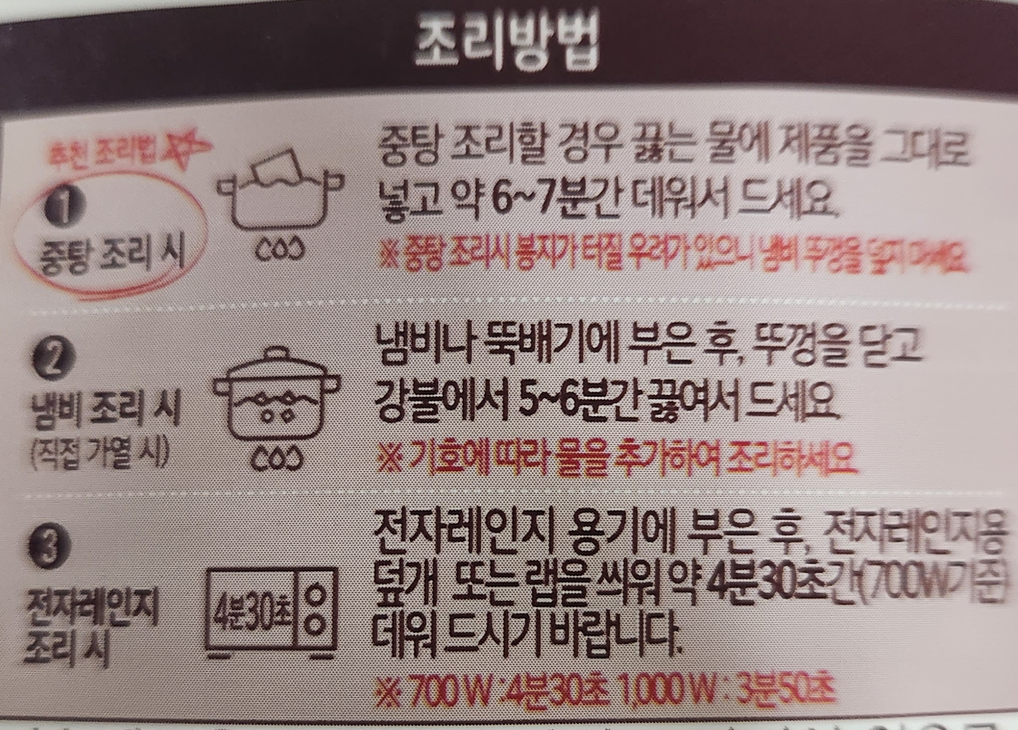 기본적으로 1인분 양이며, 실온 보관할 수 있는 제품이다. 중탕 조리, 직접 가열, 전자레인지 등 다양한 방법으로 간단하게 조리할 수 있다. 봉지째 전자레인지에 조리는 불가.