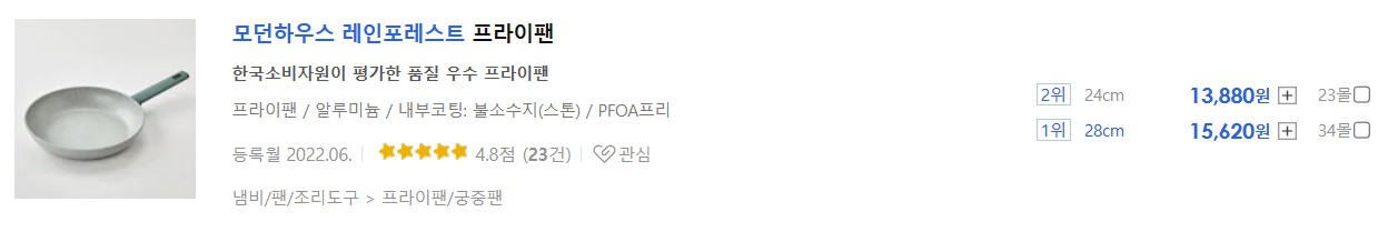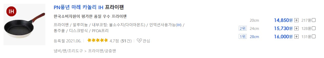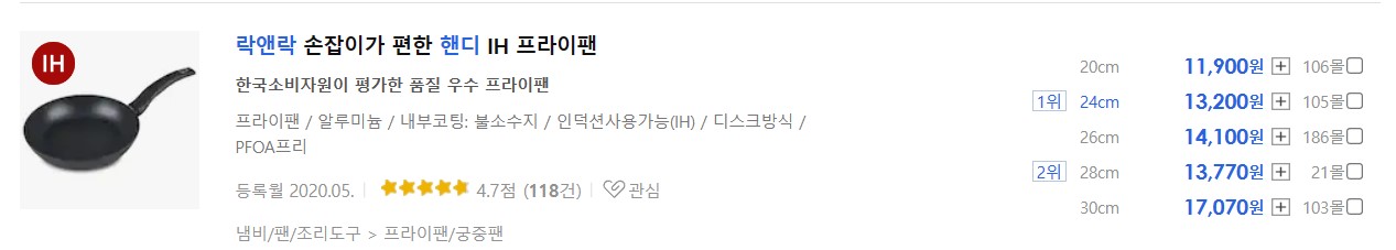 이 글에서 소개하는 프라이팬 8종 중에서 직경 24cm 기준 13,200으로 가장 가격이 저렴합니다. 후기도 가장 많은 118건입니다. 인기도 가장 많은 제품으로 추정됩니다. 락앤락이라는 글로벌 브랜드 인지도, 알려진 코팅 내구성, 경쟁력 있는 가격 삼박자를 갖춘 거의 완벽에 가까운 제품입니다.
