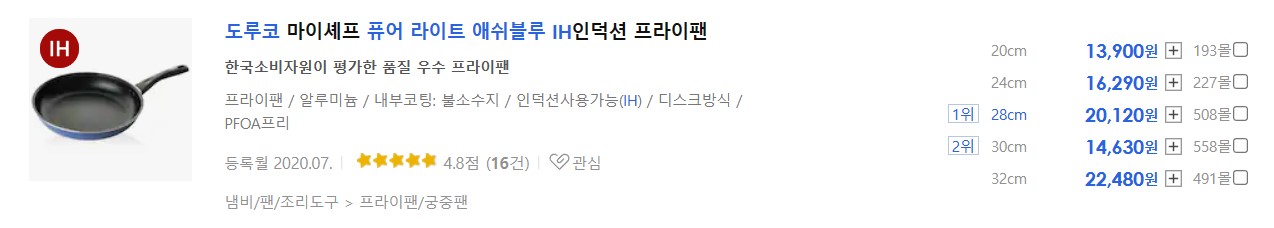 가격도 저렴하고 후기와 평점도 나쁘지 않습니다. 특히 직경 크기가 20cm에서 32cm까지 다양해서 소비자들에게 폭넓은 옵션을 제공하고 있습니다. 도루코라는 브랜드 덕분에 기존에도 소비자들이 많이 찾는 제품인데 한국소비자원의 코팅 내구성 테스트 결과가 알려지면서 더 인기가 많아진 제품입니다.