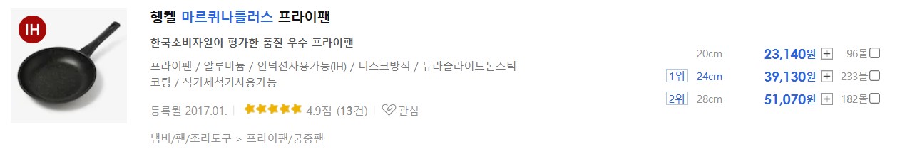 (직경 24cm 기준) 39,130원인 제품입니다. 후기도 13건으로 적당히 많고 평점이 4.9로 굉장히 좋습니다. 가격이 저렴하지는 않지만 코팅 내구성도 검증받고 이미 구매한 사람들의 후기의 평점도 높으니 조금 부담되더라도 안심하고 구매할 수 있을 것 같습니다.