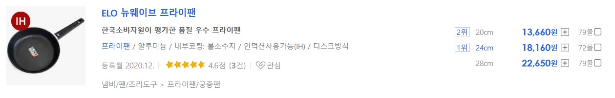 제가 가격비교를 할 때 네이버와 함께 자주 체크하는 다나와 사이트에서 직경 24cm 기준 최저가가 18,160원인 제품입니다. 후기 3건에 평점은 4.6으로 그렇게 인기가 많은 것 같지는 않지만 코팅 내구성 실험을 통해 검증된 제품이며 가격도 경쟁력이 있습니다.