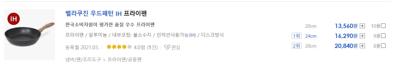 손잡이가 나무 패턴으로 된 프라이팬 제품입니다. 직경 24cm 기준 가격은 16,290으로 저렴합니다. 다나와 사이트에는 후기도 거의 없고 평점도 높지 않지만 네이버에서 검색하면 후기글도 많고 평점도 4.8로 좋습니다. 프라이팬으로 볶음밥 등의 요리를 많이 하기 때문에 저는 이미지에서 보는 것과 같이 깊이가 조금 있는 이런 제품을 좋아해서 하나 구매했습니다.