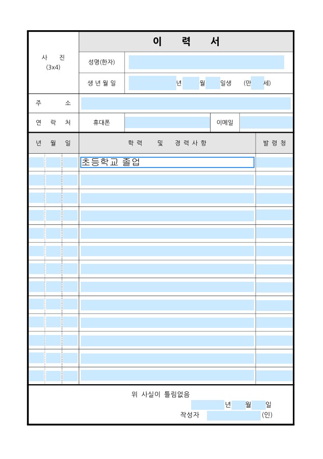 이력서에서 지원자가 직접 입력해야 되는 부분에 글씨를 입력할 수 있는 pdf 파일을 아래에서 다운로드할 수 있도록 준비했습니다.