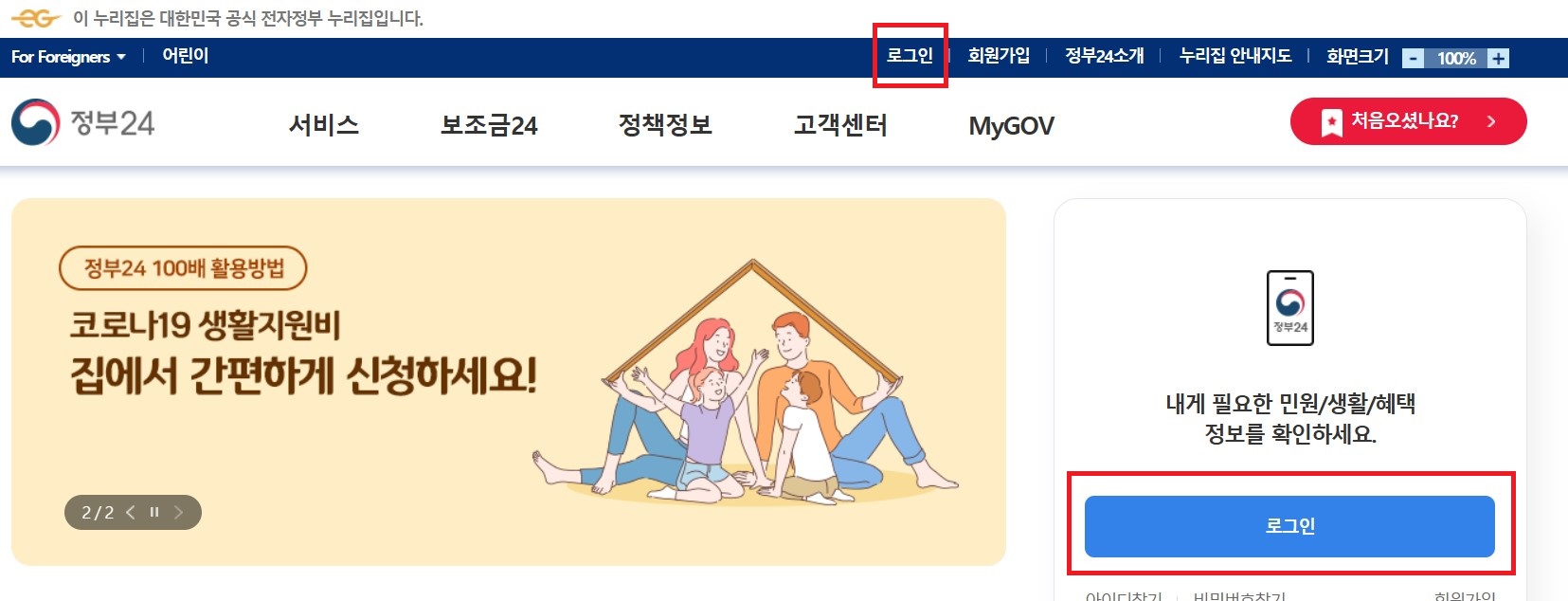 로그인을 마치면 정부24 홈페이지 메인화면 상단 메뉴에 '보조24'로 이동해도 되지만 오른쪽 간편 메뉴에 큰 글씨로 보조금24, 그리고 아래 숫자가 보이는 곳으로 이동해도 됩니다.