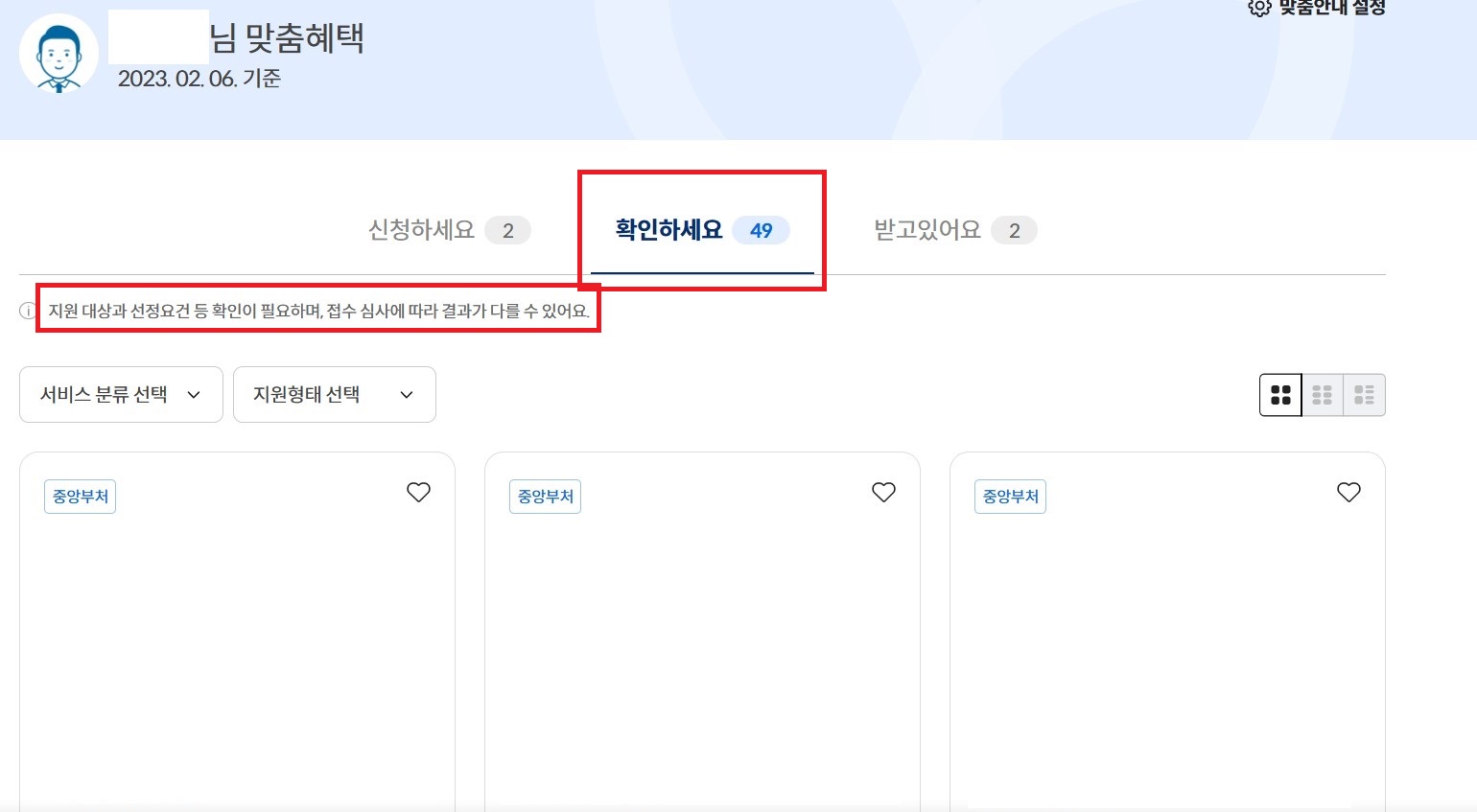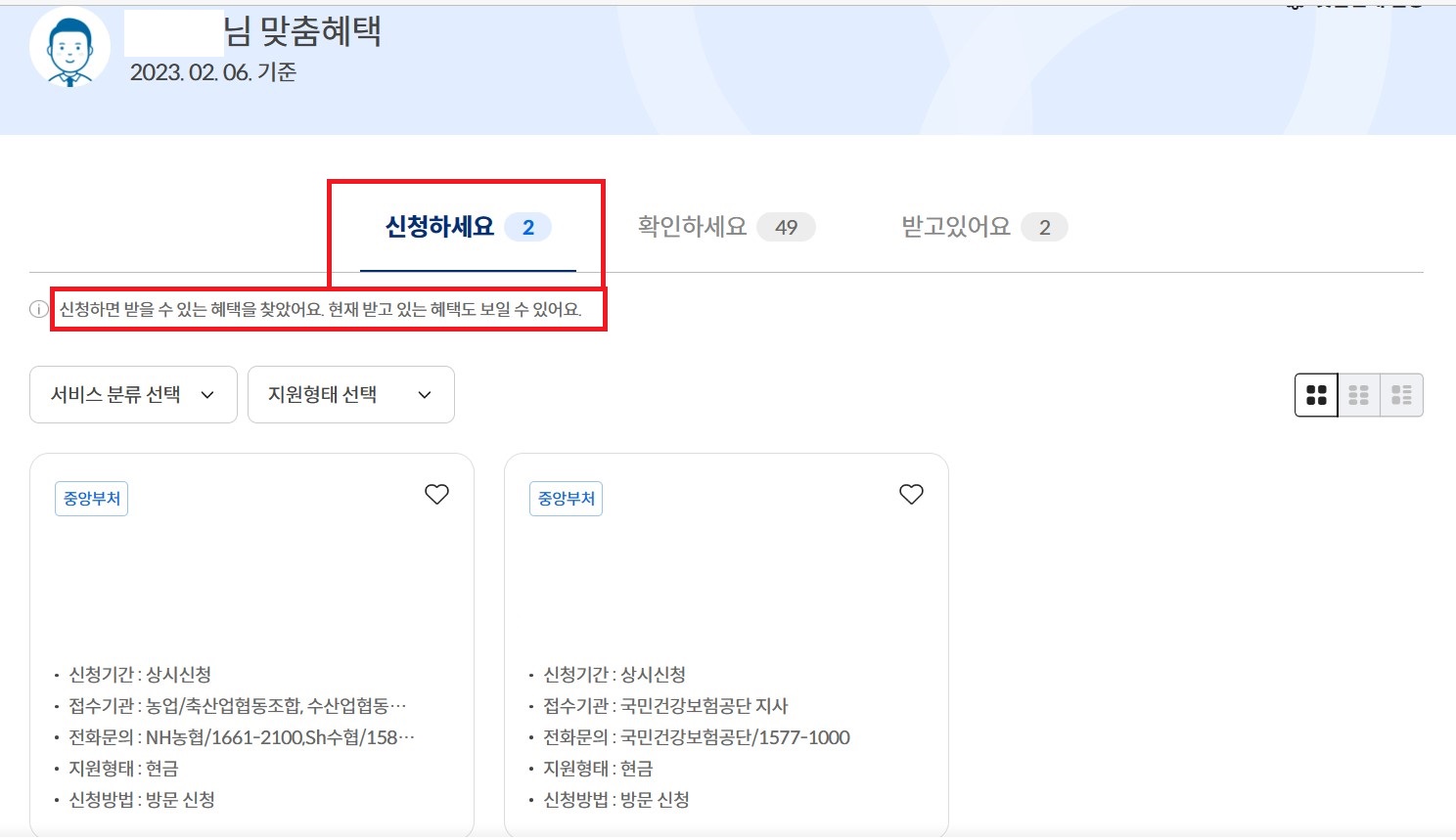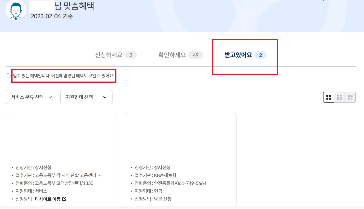 '받고있어요'는 본인이 현재 받고 있는 보조금 혜택입니다.