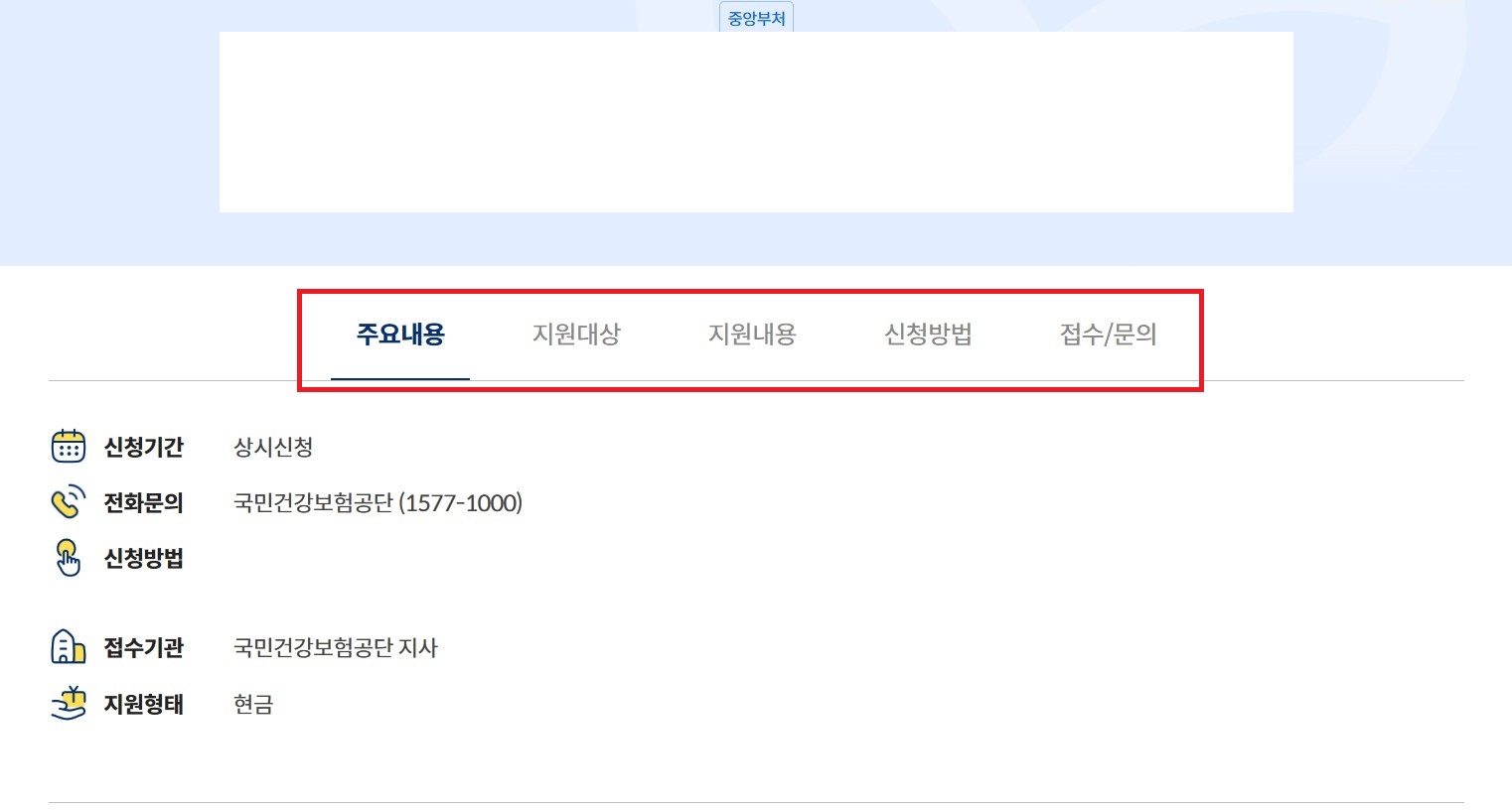'신청하세요' 메뉴는 절차에 따라 문제없이 신청을 하면 꼭 받을 수 있는 보조금 혜택을 표시합니다. 각각의 보조금 서비스를 클릭하면 주요내용, 지원대상, 지원내용, 신청방법, 접수/문의 등의 상세사항을 확인할 수 있습니다.