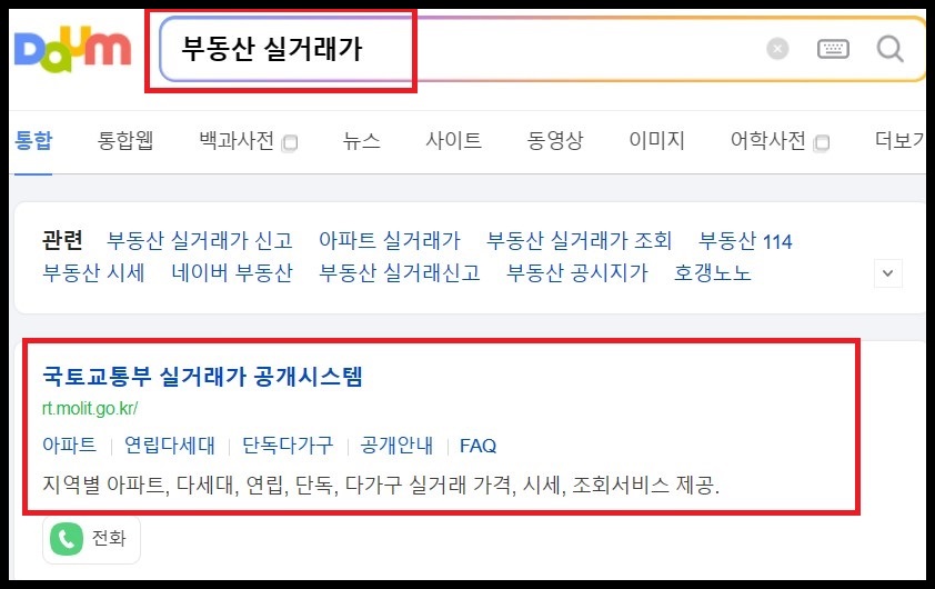 1. 검색 사이트에서 '부동산 실거래가'를 검색 후, '국토교통부 실거래가 공개시스템'으로 입장합니다.