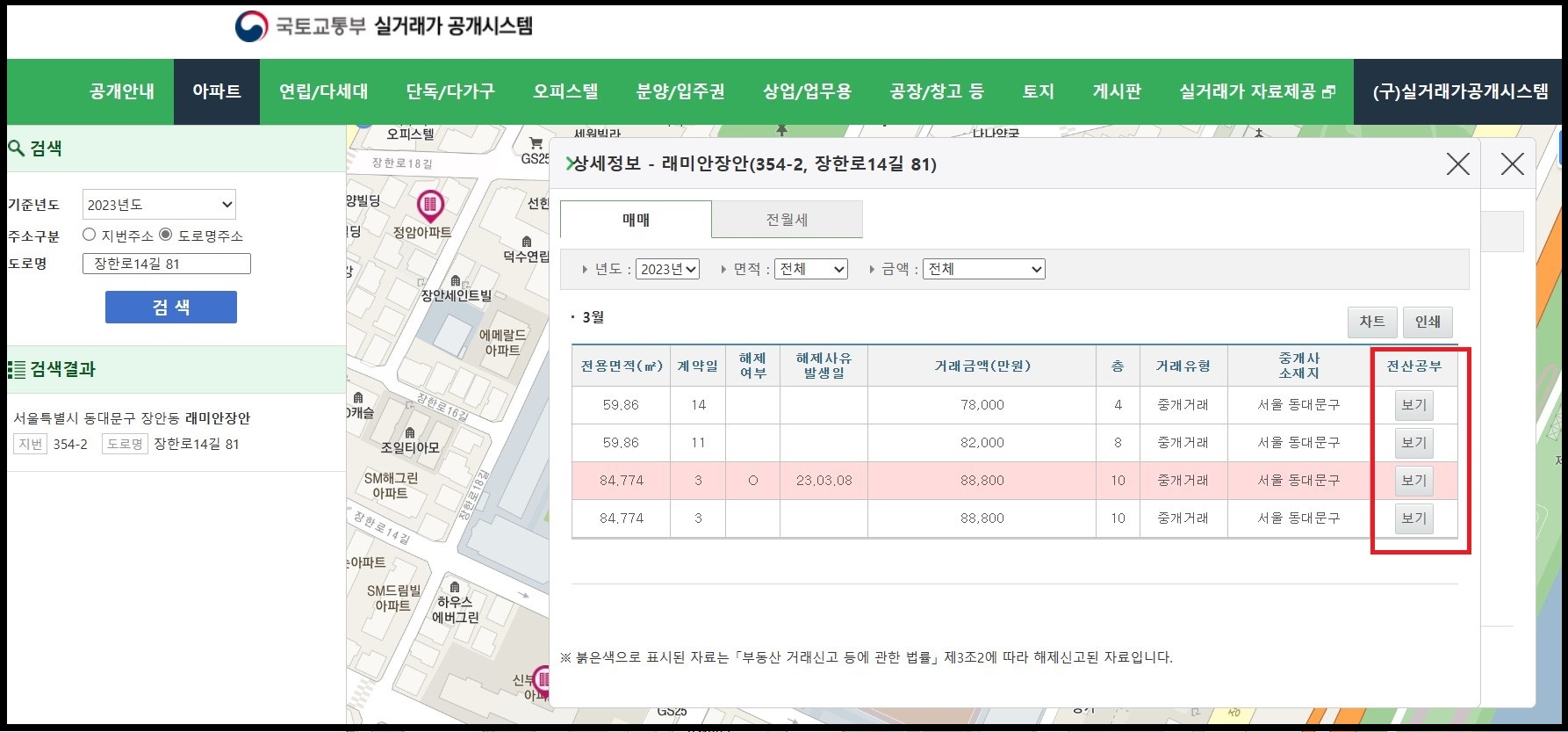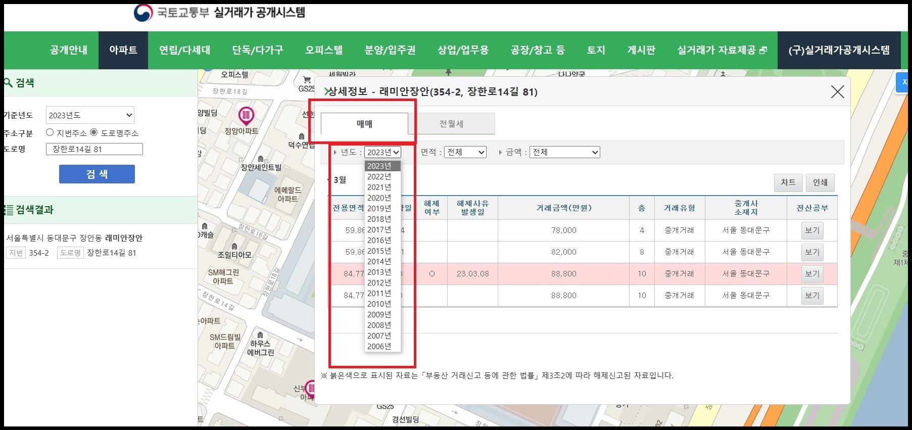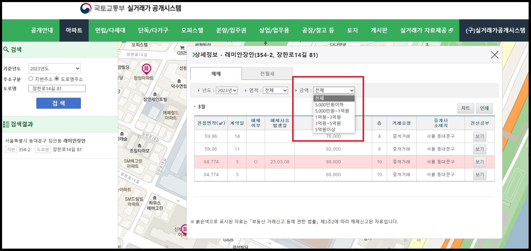 4. 서울 동대문구 장안동에 위치한 래미안장안이라는 아파트를 무작위로 선택해 보았습니다. 상세정보에서 해당 아파트 실거래가 기준 연도, 조회를 원하는 면적, 금액 기준 등을 선택해서 조회할 수도 있습니다.