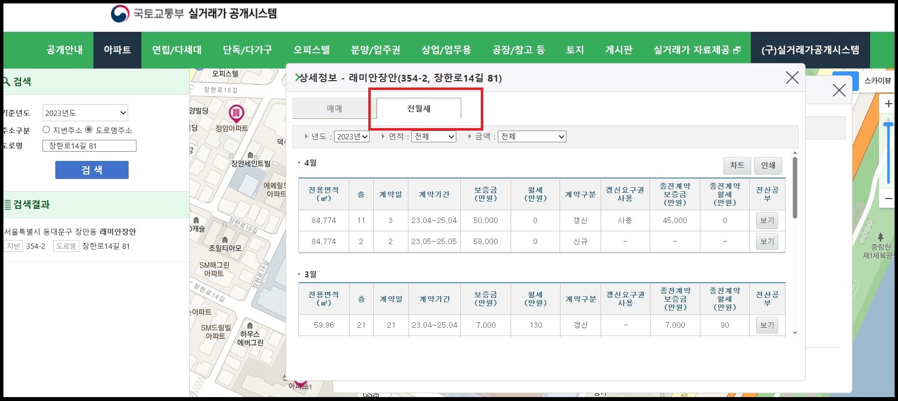 6. 추가로 매매에 대한 실거래가 뿐만 아니라 전/월세에 대한 실거래가도 조회가 가능합니다.