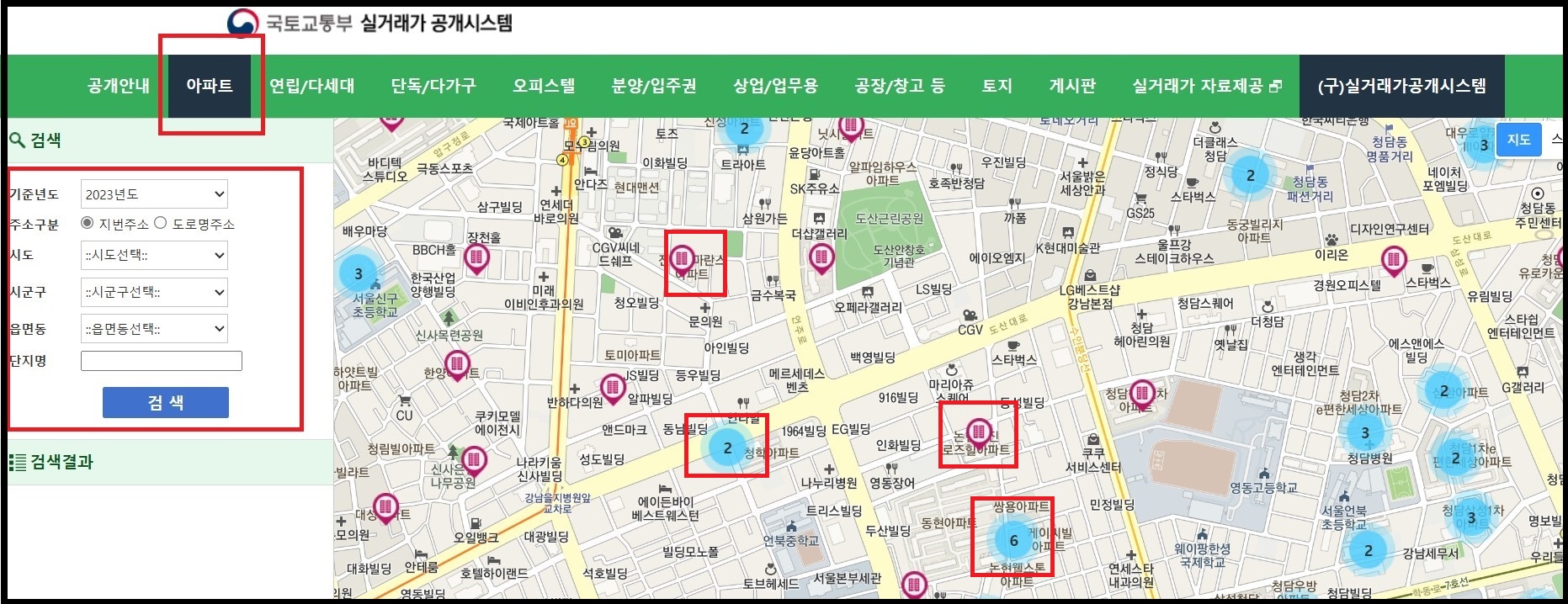 3. 이 글에서는 아파트 실거래가를 조회해 보겠습니다. '아파트'를 선택하면 화면에 지도가 나옵니다. 지도에 표시된 숫자나 건물 아이콘을 클릭해서 본인이 실거래가 조회를 원하는 아파트를 찾을 수 있습니다. 좌측 화면에 기준연도, 주소로 아파트를 직접 찾아서 조회를 할 수도 있습니다.