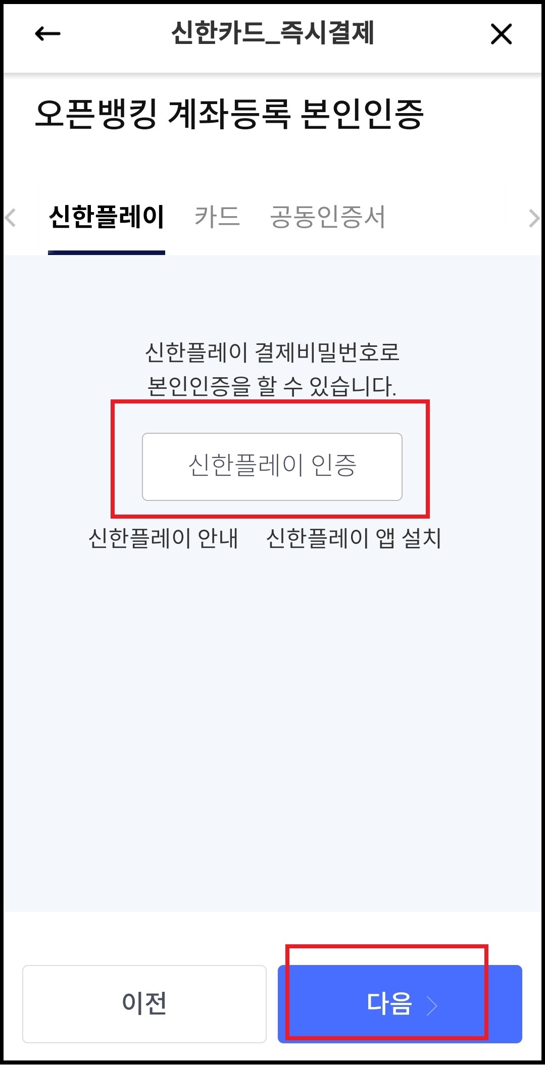 일회성 자동이체에 대한 본인인증을 [신한플레이], [카드], [공동인증서] 중 본인이 원하는 수단으로 진행할 수 있습니다. 인증을 완료했다면 [다음]을 선택합니다.