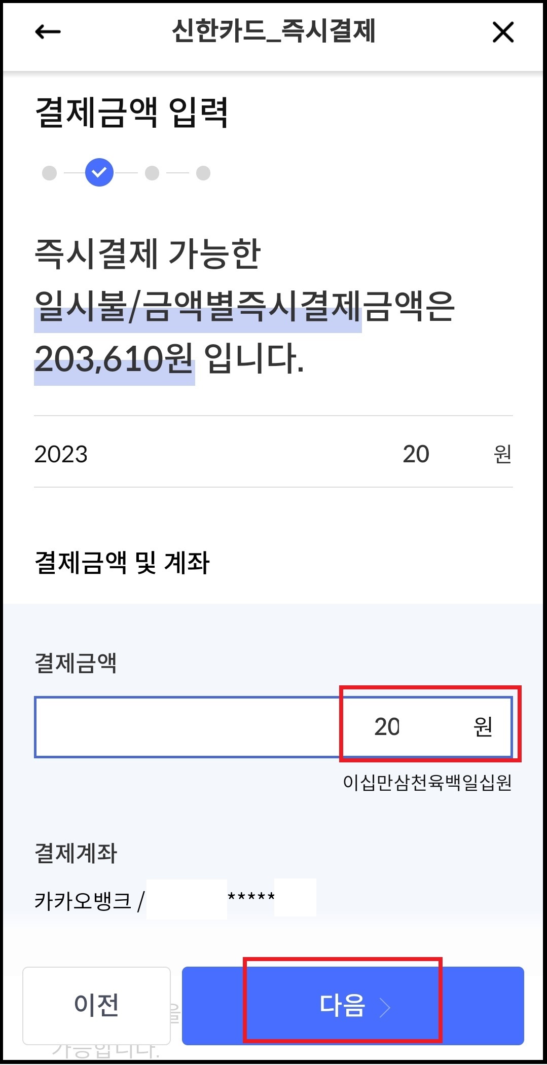일시불에 대한 미결제 금액 총액이 표시됩니다. 해지를 위해 완납을 해야 하기 때문에 표시된 금액 모두를 [결제금액] 란에 입력해 줍니다. [다음]을 선택해서 이동합니다.