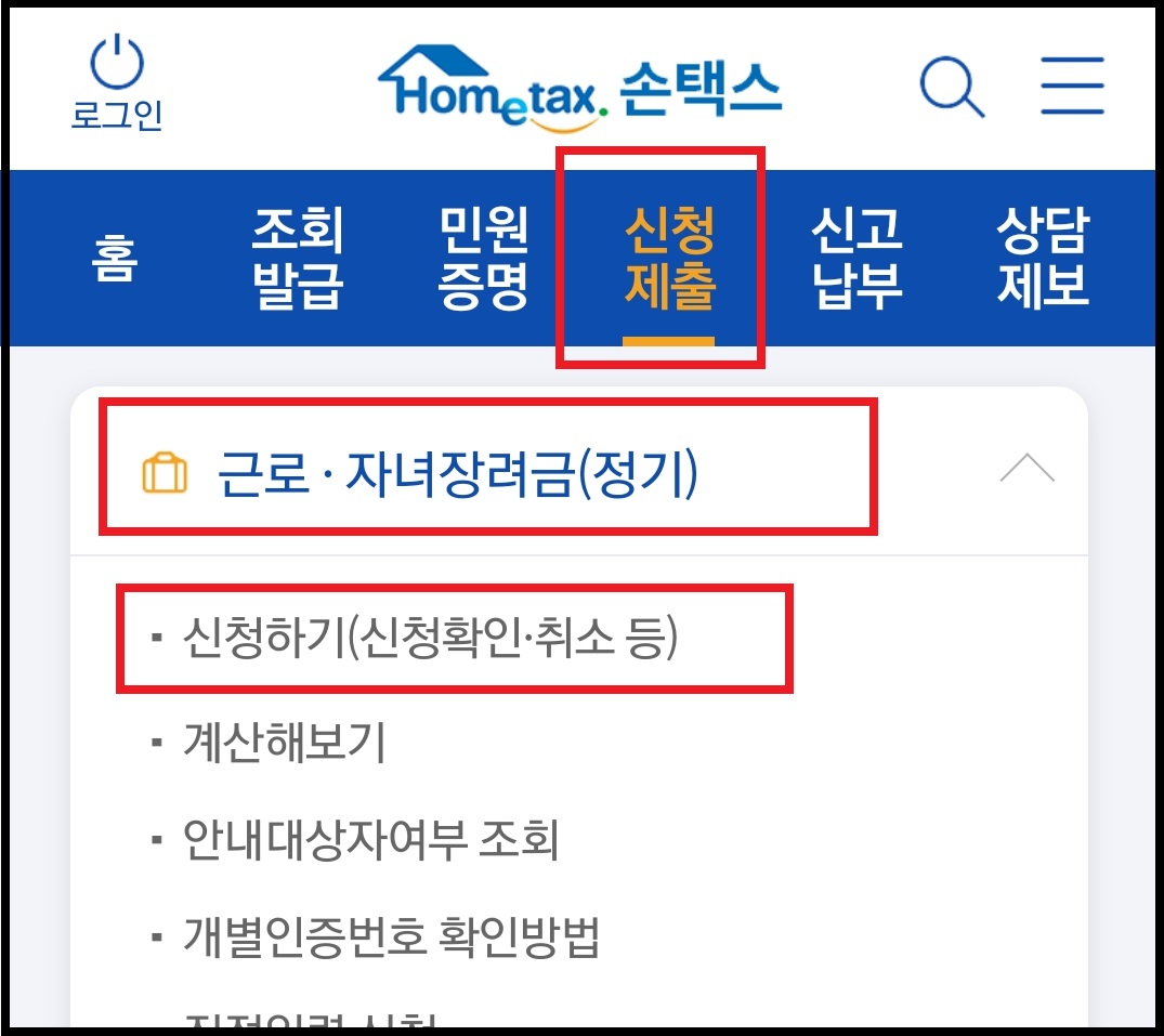 먼저 국세청 공식 앱인 손택스로 접속해서 로그인까지 완료합니다. 기존에 앱을 설치하지 않았다면 다운로드해서 본인의 인증서를 등록하면 생각보다 간단하게 로그인할 수 있습니다. 손택스 메인화면의 상단 메뉴 중 [신청∙제출]로 입장합니다.