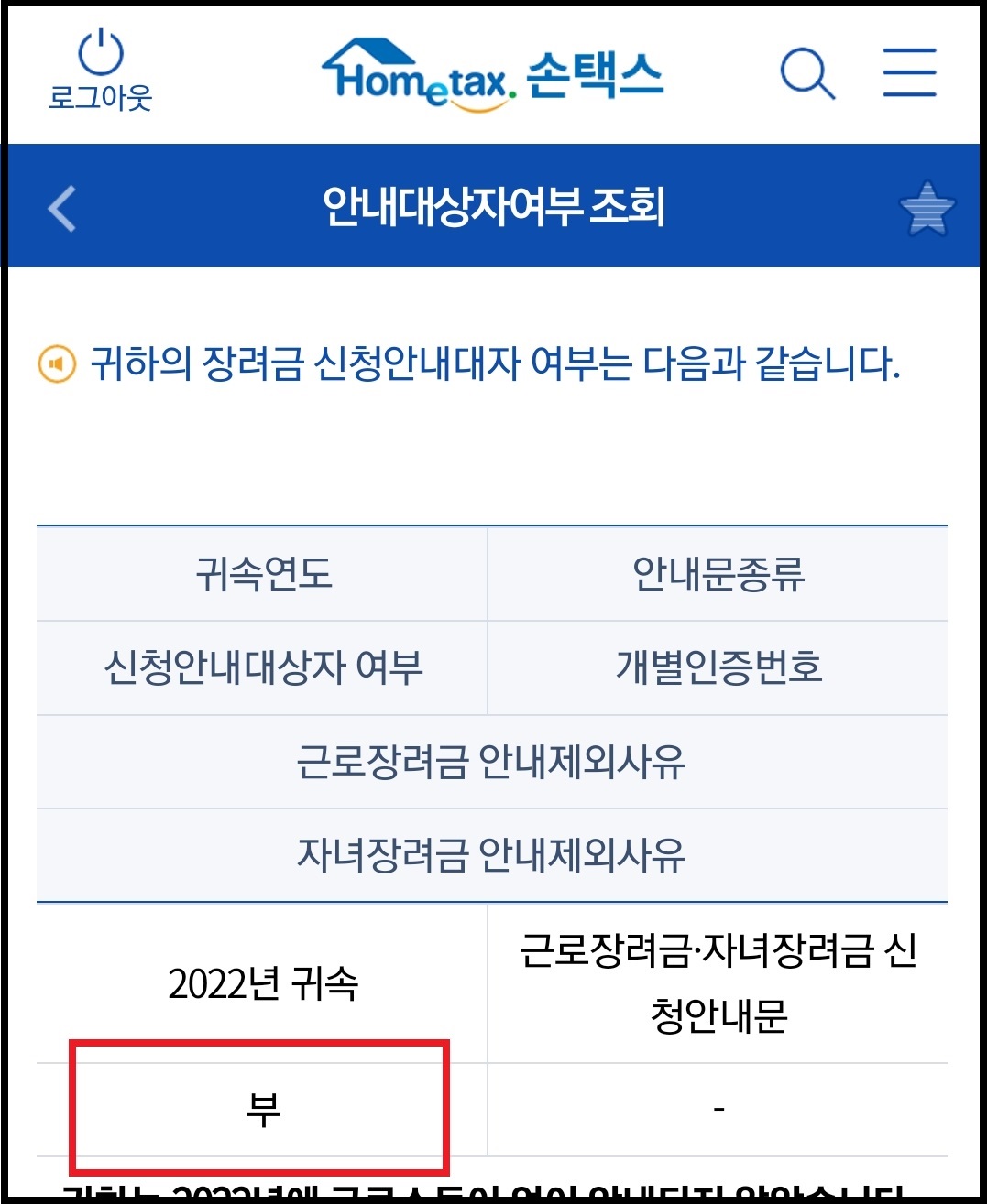 '2022년 귀속'에 '부'라고 표시되어 있다면 근로장려금 대상자가 아닙니다. '여'라고 표시되어 있어야 근로장려금 대상자이기 때문에 '여'라고 쓰여있다면 [신청∙제출] -> [근로∙자녀장려금(정기)] -> [신청하기(신청확인∙취소 등)]에서 근로장려금 신청을 진행하시면 되겠습니다.