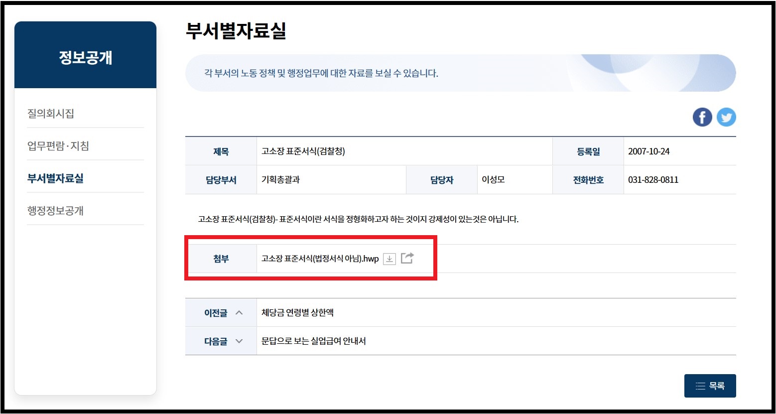검색 결과로 나오는 '기획총괄과, 고소장 표준서식(검찰청)[중복문서 1건]'을 클릭해서 입장합니다. 첨부에 있는 '고소장 표준서식(법정서식 아님).hwp' 고소장 한글 파일을 다운로드할 수 있습니다.