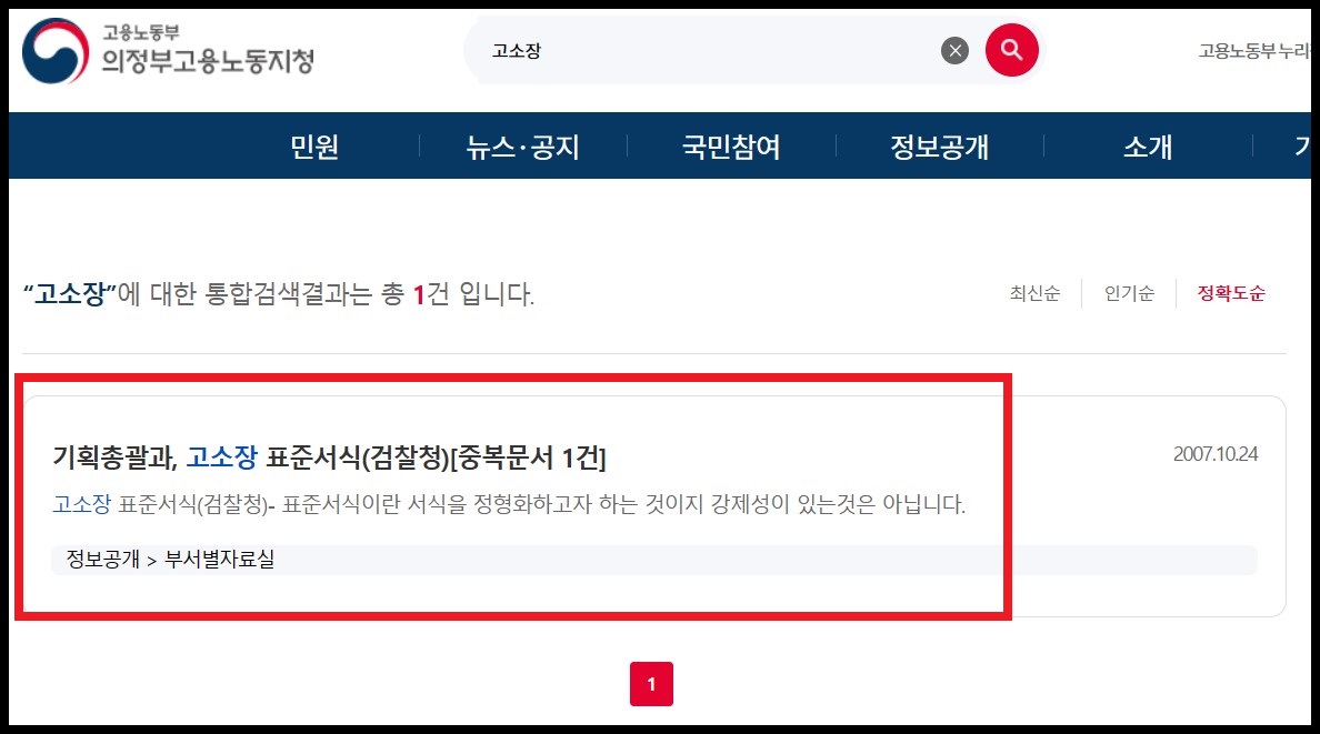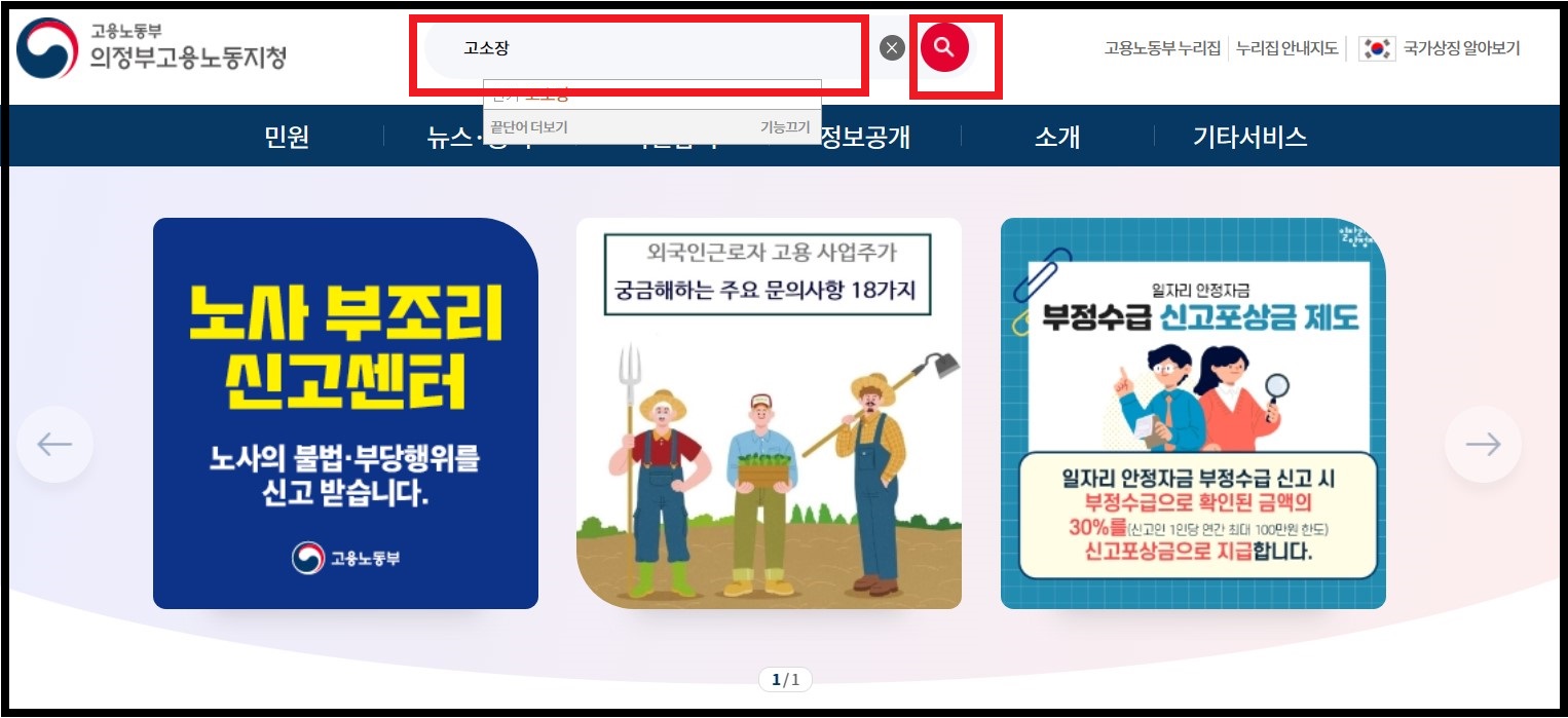 직접 찾아서 다운로드하고 싶다면 다음의 절차를 밟으면 됩니다. 검색창에 '의정부고용노동지청'을 검색해서 해당 공식 홈페이지에 접속합니다. 메인화면 상단 검색어 입력란에 '고소장'을 입력하고 검색 아이콘을 클릭합니다.
