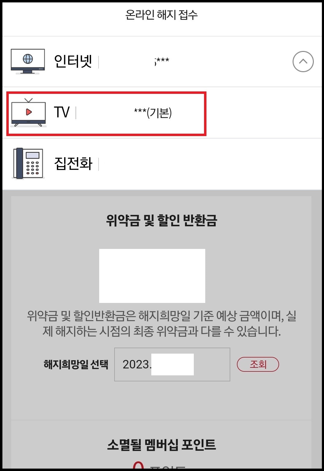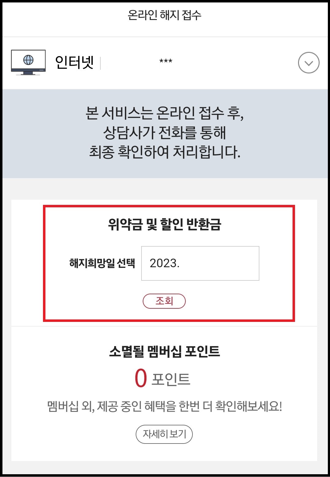 [위약금 및 할인 반환금] 부분에서 [해지희망일 선택]에 날짜를 선택하고 [조회]를 누르면 해당 날짜에 해지했을 경우 물게 될 위약금을 알 수 있습니다.