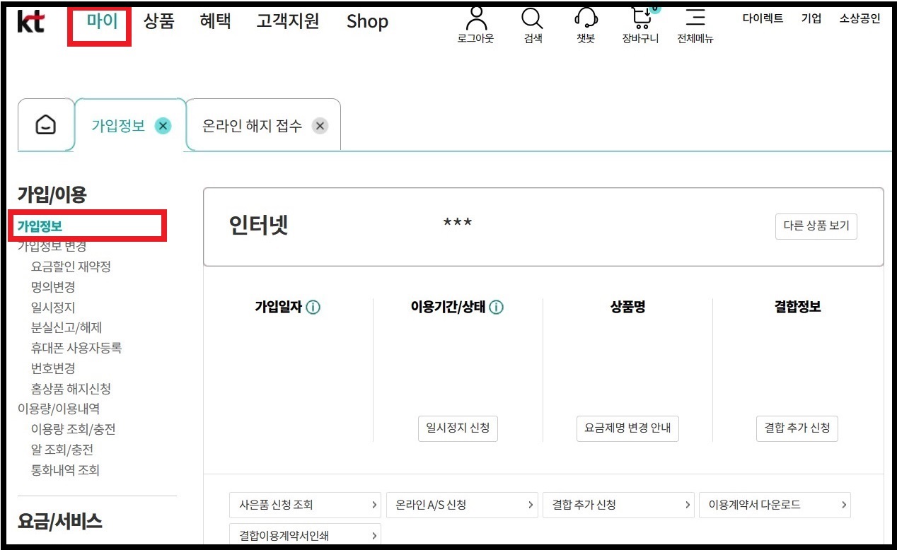 KT 홈페이지에 로그인 후, 상단 메뉴 [마이]를 선택하고 좌측 메뉴 중 [가입/이용] -> [가입정보]로 이동합니다.