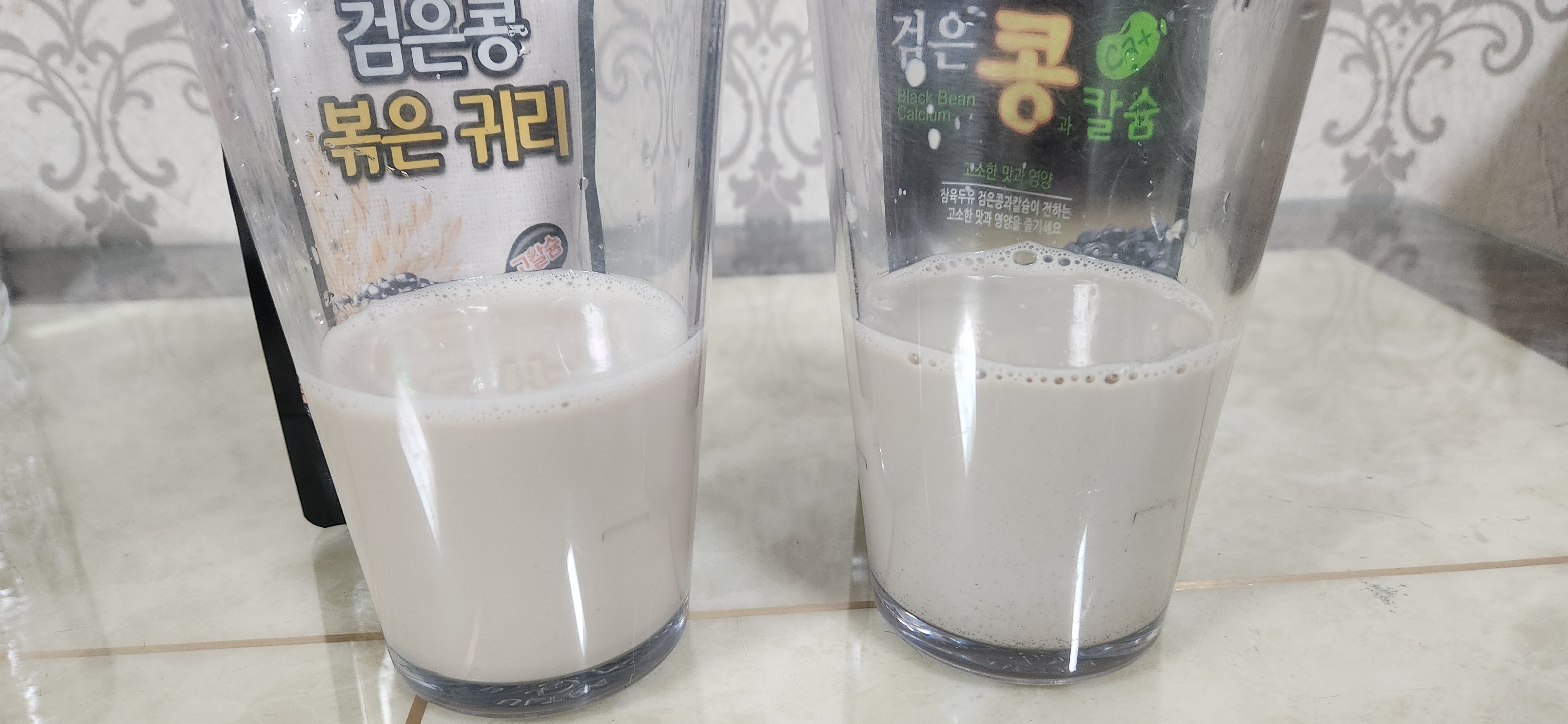 검은콩볶은귀리와 검은콩과칼슘 두 제품을 컵에 따라 놓고 비교해보니 귀리를 포함하고 있어서 그런지 확실히 검은콩볶은귀리 제품의 색깔이 연하다.