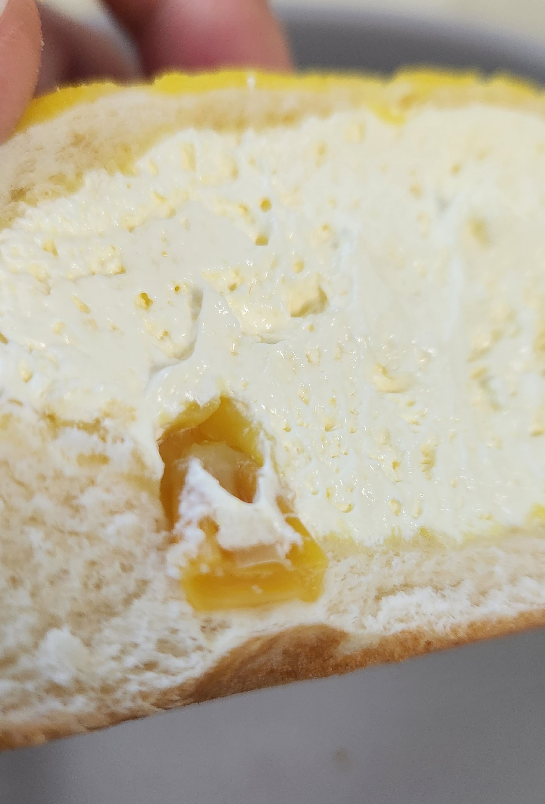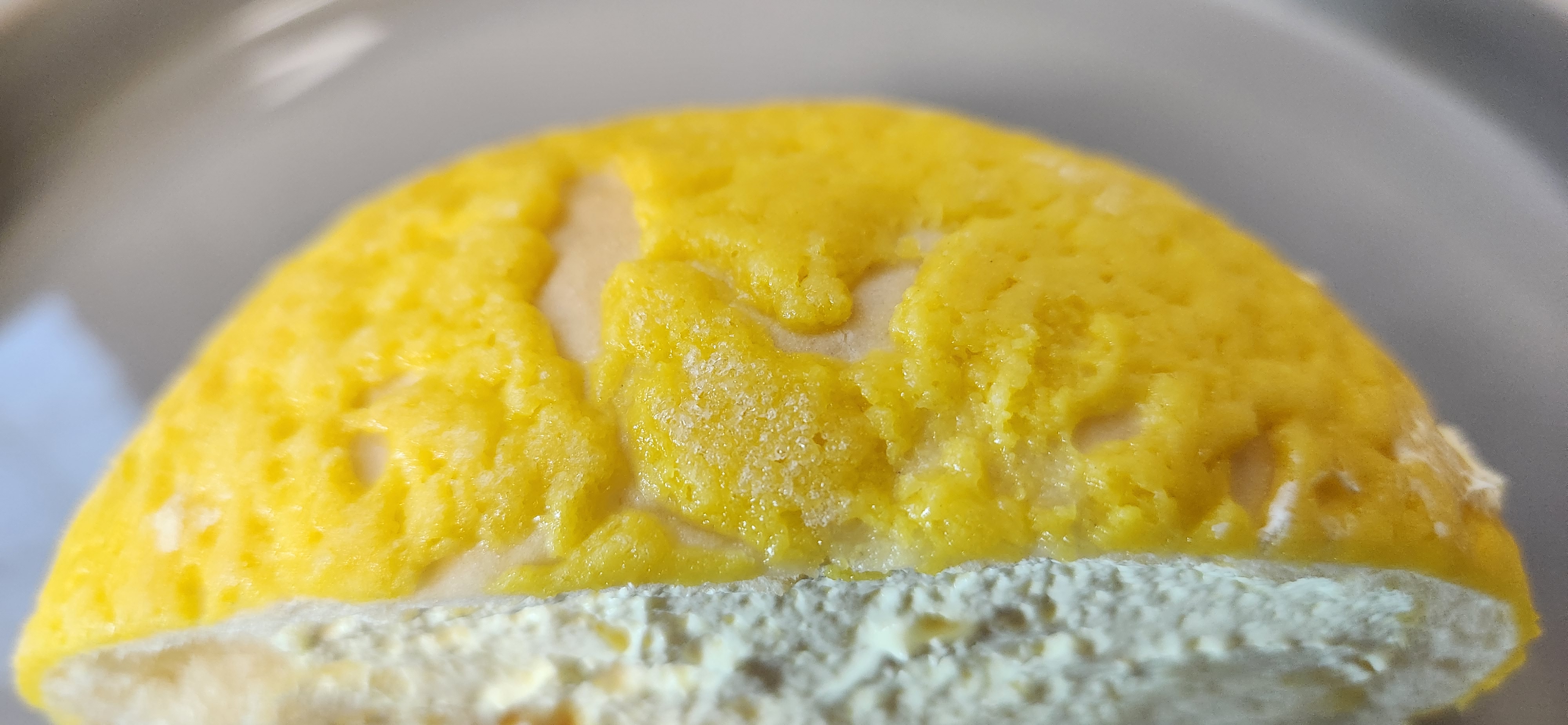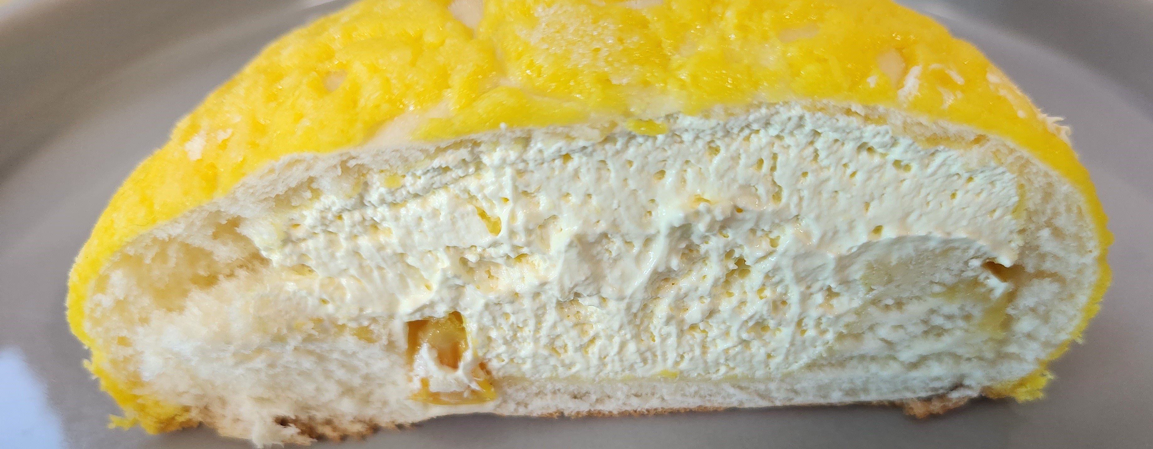다른 연세우유 크림빵들은 겉면이 그냥 빵인데 옥수수크림빵은 겉면이 소보루처럼 옥수수쿠키로 덮혀있다.