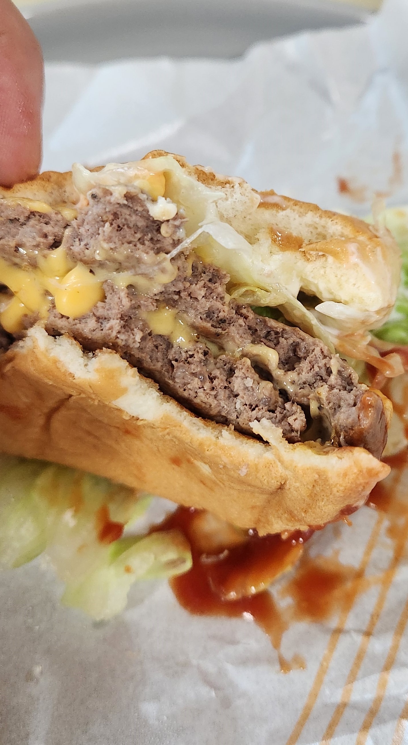 적어도 외관 상으로는 더블쿼터파운드치즈버거보다 더블X2가 양상추가 훨씬 많아 보인다.